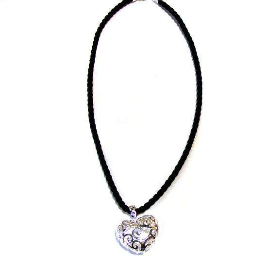 This is a silver necklace with a braided cotton string. It features a silver openwork pendent in heart shape. It matches outfits in unisex style.