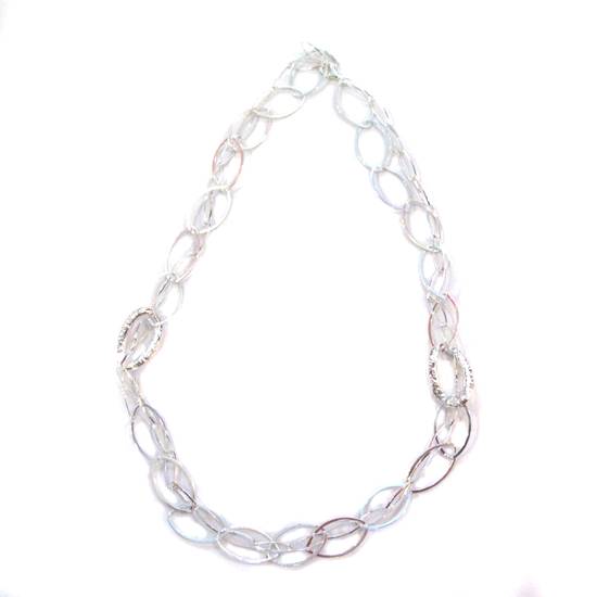 This silver necklace presents a regular but attractive outlook. The major thing you can find from this necklace is the interlocking oval-shaped pieces that are featured along the whole necklace. Some of them are specially designed, such as the two thicker pieces on both sides, which add more interesting elements to the necklace.