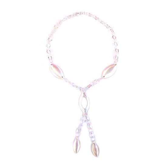 This necklace presents several oval-shaped pieces on its chain and drop. Two pieces of those are found on the chain, placed symmetrically on the left and right. Two other pieces are put at the end of the drop. Another oval piece, with a hollow oval, is in the middle, connecting the upper and lower parts of the necklace.