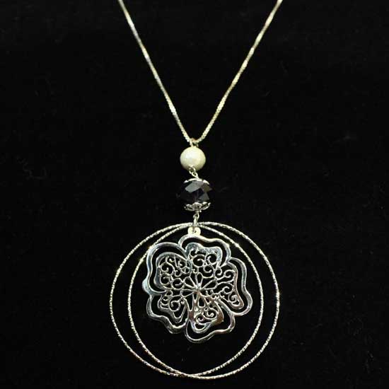 As shown is a silver necklace featuring an adorable flower pendant. The delicate flower is set with two shiny rings to show a graceful appearance. A pearl and a shiny stone are added to make a perfect remark.