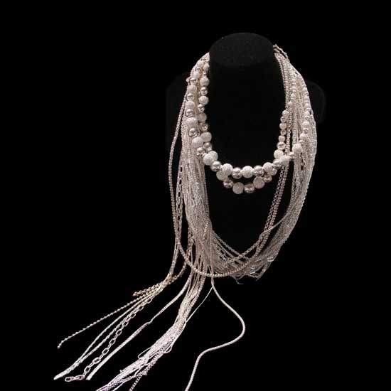 This is a silver necklace that is finely crafted with exquisite details for a sense of attractiveness. It boasts a long design and is accented with chained strands and balls. This elegant necklace is easy to mix and match with your fashionable wear for a trendy look.