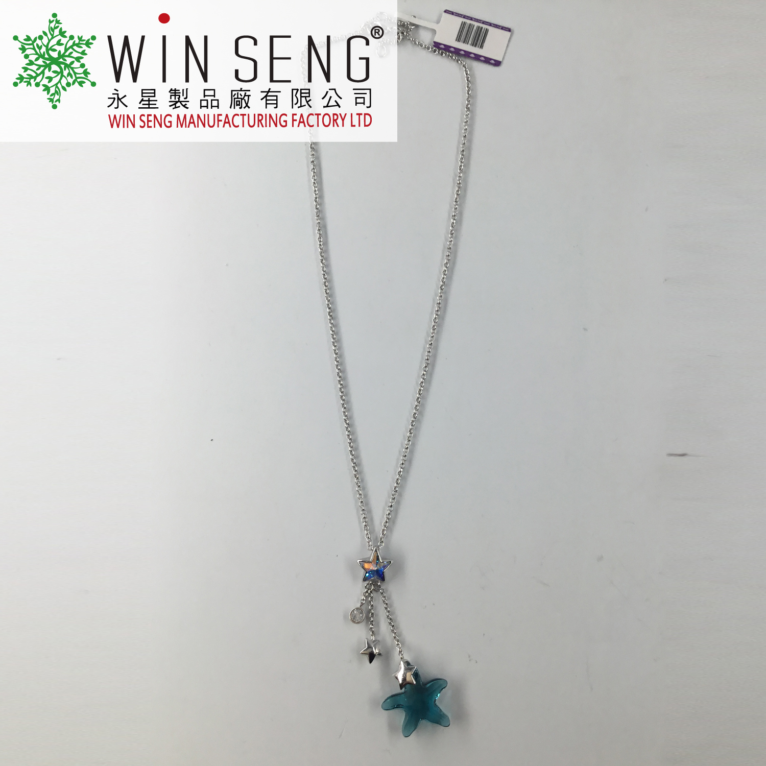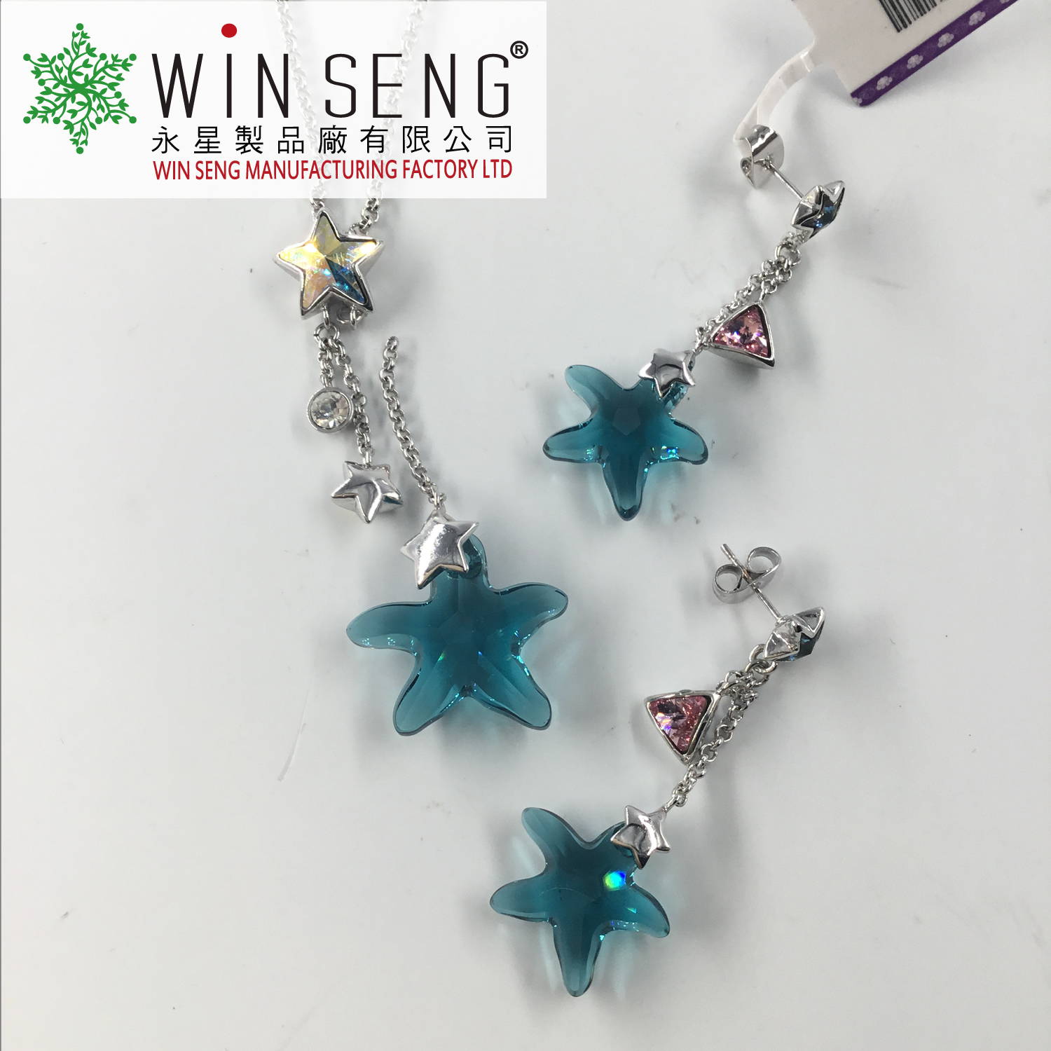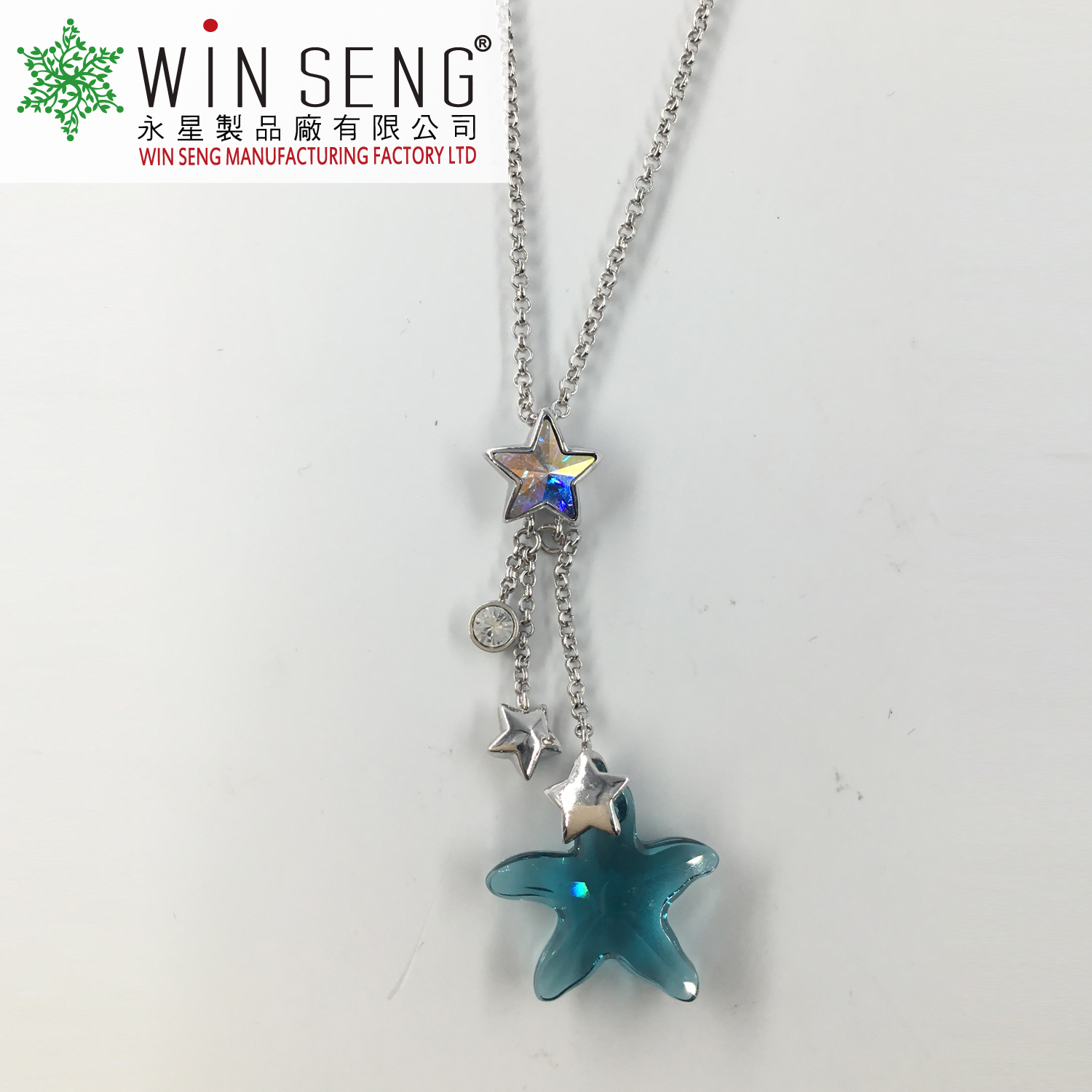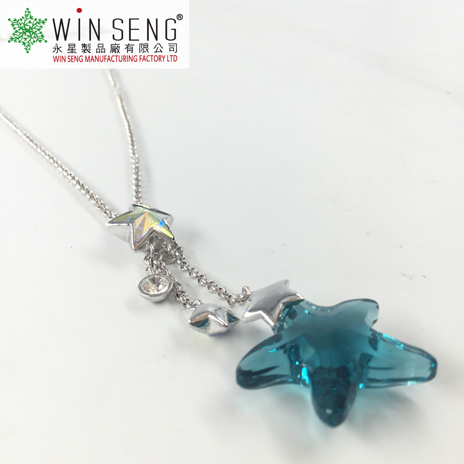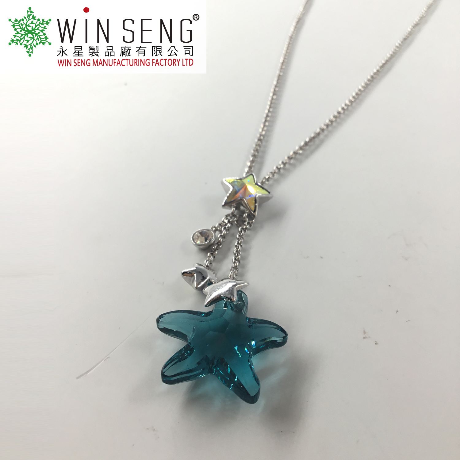 Featured here is a silver necklace embellished with crystals from Swarovski. It has a blue star-shaped crystal as the centerpiece and is adorned with smaller star-shaped charms. This silver necklace is meticulous crafted with meticulous attention to details and is a great accessory for all occasions.