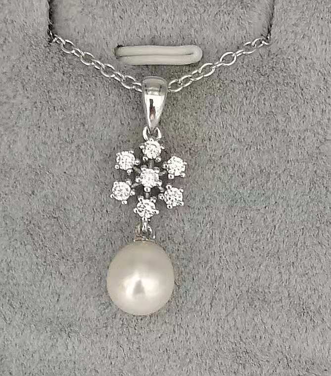 • Silver pearl pendant, snow flake shape silver part with CZ & 1pc. of fresh water pearl drop shape in white color, all metal are 925 sterling silver in rhodium plated, free of nickel.