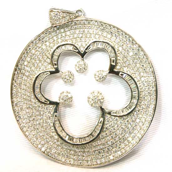 The dazzling round-shaped pendant features a silver 925 construction with a cut-out floral pattern in the center. The clear CZ stone inlay gives it a shimmering touch. Accessorize your evening tube dress with this splendid pendant.
