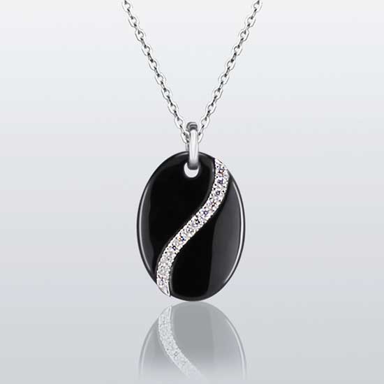 This is a pendant with an elegant and trendy design. It features a ceramic main body in black which is meticulously paved with a line of sparkling stones for an attractive and unique touch. The stylish pendant is completed with a silver chain for added value.