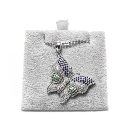 This is a silver pendant that is crafted of silver and shimmers with a highly glossy finish. This jewelry piece features paved CZ stones to create a lovely and colorful butterfly design. The combined colors in white, purple and green will add some flair to your outfit.