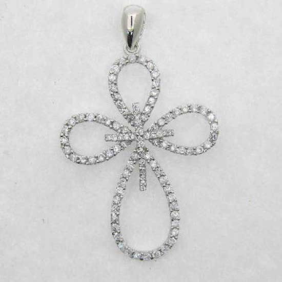 Displayed is a silver pendant that comes in a flower shape. Plated with rhodium, this pendant is paved with CZ stones for a sparkling look. This beautiful silver pendant is suitable for everyday wear.