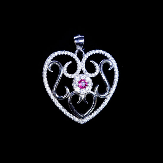 This is a silver pendant that shimmers with a high-gloss finish. The allover dazzling CZ stones are well paved on the heart silver setting. The pink stones in the center add a touch of style to the whole piece.