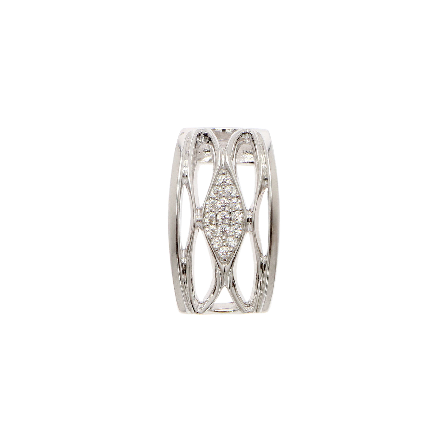 The pictured pendant comes in a wide band design and is set with multiple cubic zirconia stones. It is made of 925 sterling silver and has a rhodium-plated surface. This pendant delivers timeless elegance and is great for using as a fashion accessory.