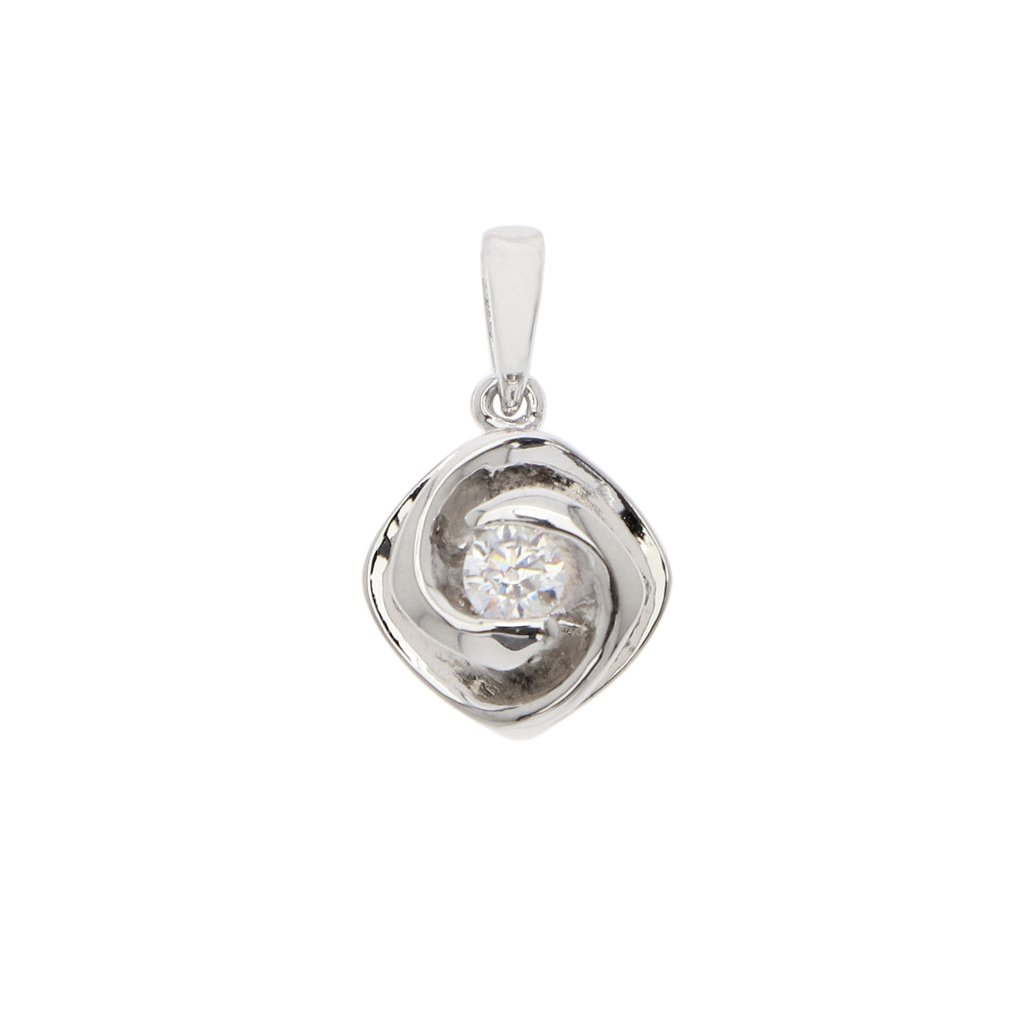 Highlighted here is a 925 sterling silver pendant with rhodium-plating. It has a cubic zirconia stone in the center and has a clasp on top for attaching. This silver pendant offers long lasting beauty and is excellent for paring with necklaces or bracelets.