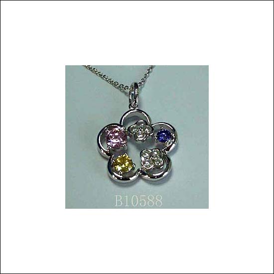 Foster a playful attitude with this pretty sterling silver pendant. Five little gems are attached to the floral shaped frame like a dessert platter on display. Inside the frame are two smaller blossoms each set with four glistening white stones. Three colored stones, two bigger stones in pink and amber, and a smaller one in blue, offer a rainbow hued beauty sure to delight girls.