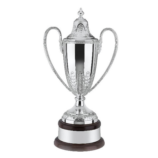 This is a silver plated trophy that is finely crafted with refined details. It comes with a high-gloss finish. This high-end trophy has a top cup and a round base with a matching design.