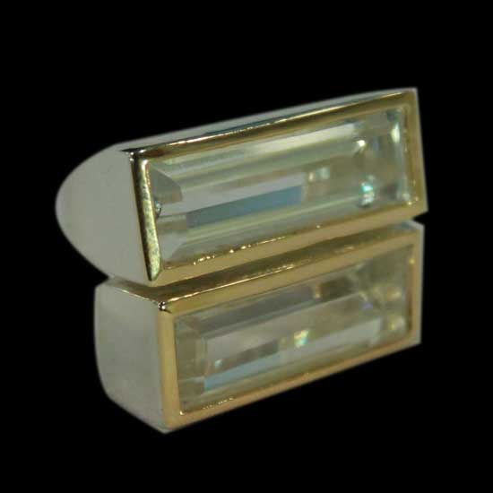 The silver ring features double rectangular-shaped ornaments that exude a touch of uniqueness. Its band impresses you with a burnished golden finish. Match this piece with other fine jewelry for your coming evening parties.