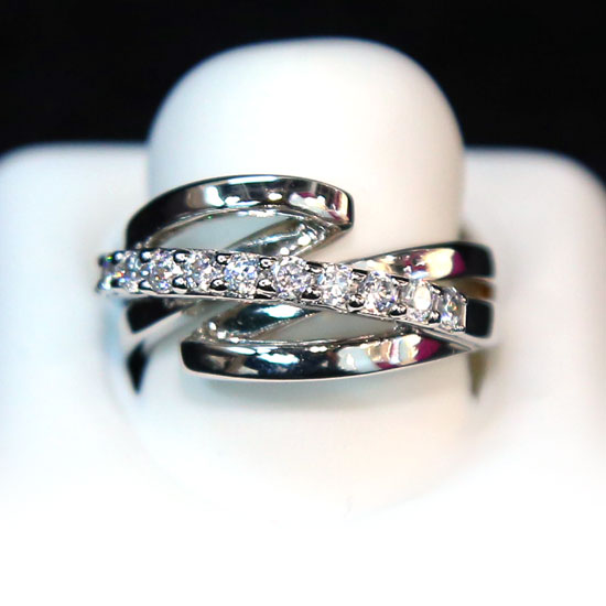 This is a finger ring with a sophisticated and unique design. It is made of silver with a twisted structure. This ring is accented with shimmering CZ stones for added luxuriousness.