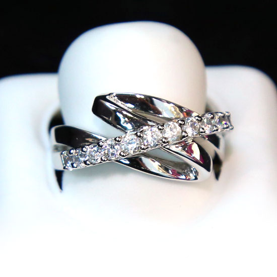This is a silver ring with a modern appearance. It features a twisted structure for a touch of uniqueness. The shimmering CZ stones give enhanced charm and glamor to this design.