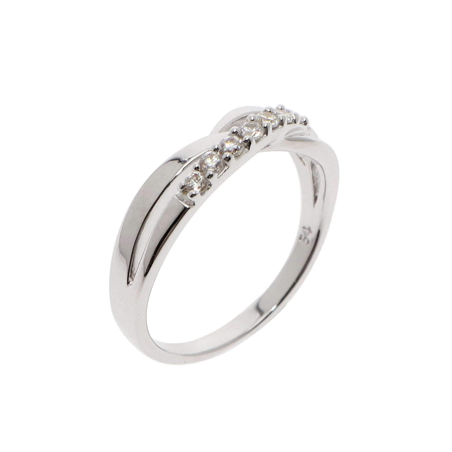This ring is made of 925 sterling silver and is rhodium-plated for added shine and durability. It comes in an overlapping band design and is set with white cubic zirconia stones on the top band. The ring flaunts meticulous workmanship and is an excellent accessory to completing a classy look.