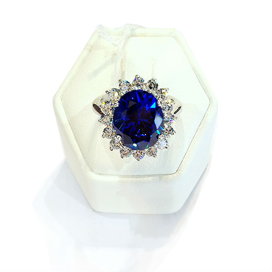 This elegant ring appeals to people instantly with its sparkling and classic design. It is inlaid with a created round blue sapphire as the centerpiece. The dazzling stones complement this design with a beautiful flower appearance.