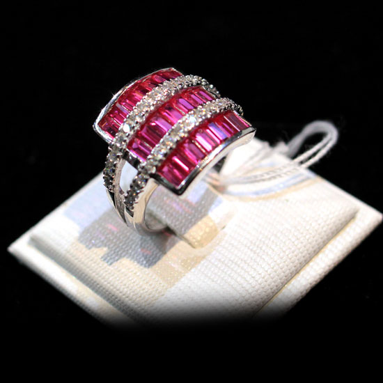 This beautiful silver ring is designed with fancy sparkling stones. Two bands of clear stones stretch across a square shape of pink rectangular stones. This piece of simplistic jewelry is a fashionable addition to your everyday look.