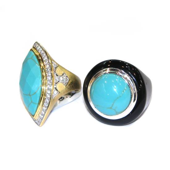 These rings look attractive, mainly because of the fresh-looking CZ stones on the setting. One of them features a round-shaped stone, while the other one has a marquise-shaped one. The round-shaped piece is in cabochon cut, meaning that its surface is smoothly polished. The other one shows rhombus-shaped facets on the surface, sparkling beautifully.