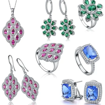 Silver Synthetic Corundum in red, blue & green with pendant, earring & ring.