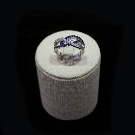 This silver ring entices you with its gorgeous design. The multi-layered shank is channel-set with blue and white crystals. This shimmering ring is excellent for formal occasions.