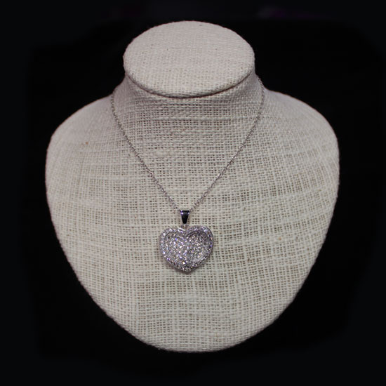 This heart-shape pendant is breath-taking with its dazzling shimmer. The silver surface is fully encrusted by white CZ stones for extraordinary charm. This elegant piece is perfect for complimenting your sophisticated look.