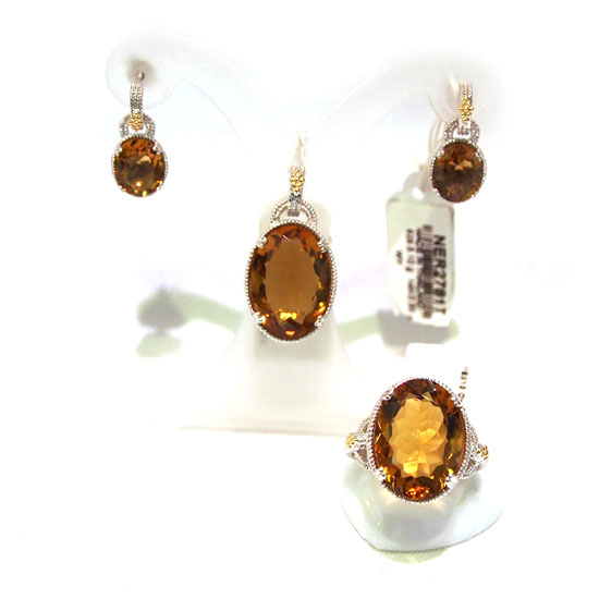 This jewelry set is finely made with sophisticated details with the combination of silver and gold. Each item is beautifully adorned with a large shimmering brown stone, showcasing a sense of elegance with femininity. This jewelry set is a great item to enhance your jewelry collection.