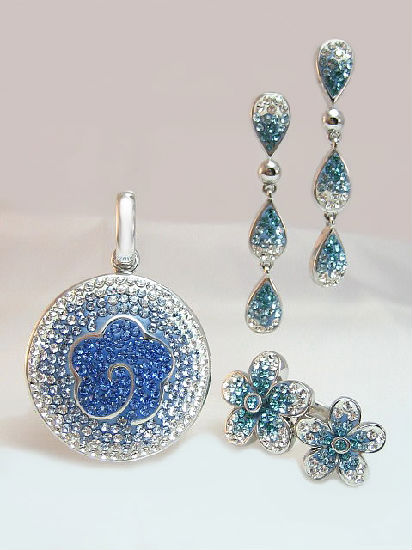 • This is a silver ring, pendant and earrings decorated with Swarovski crystal beads.