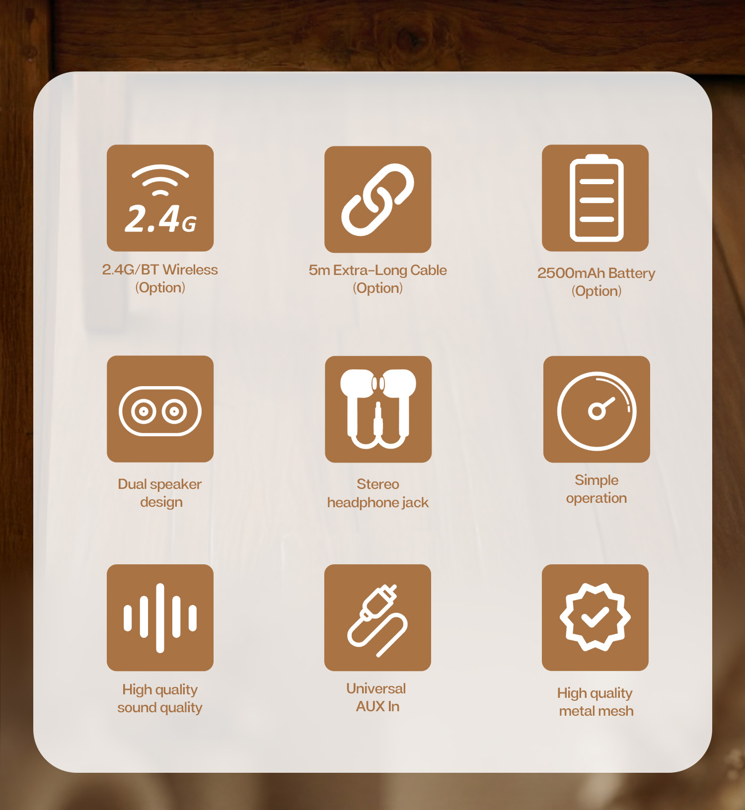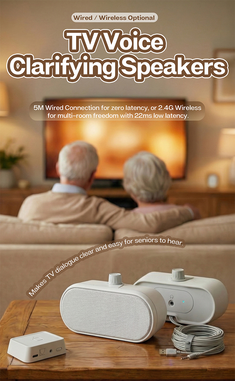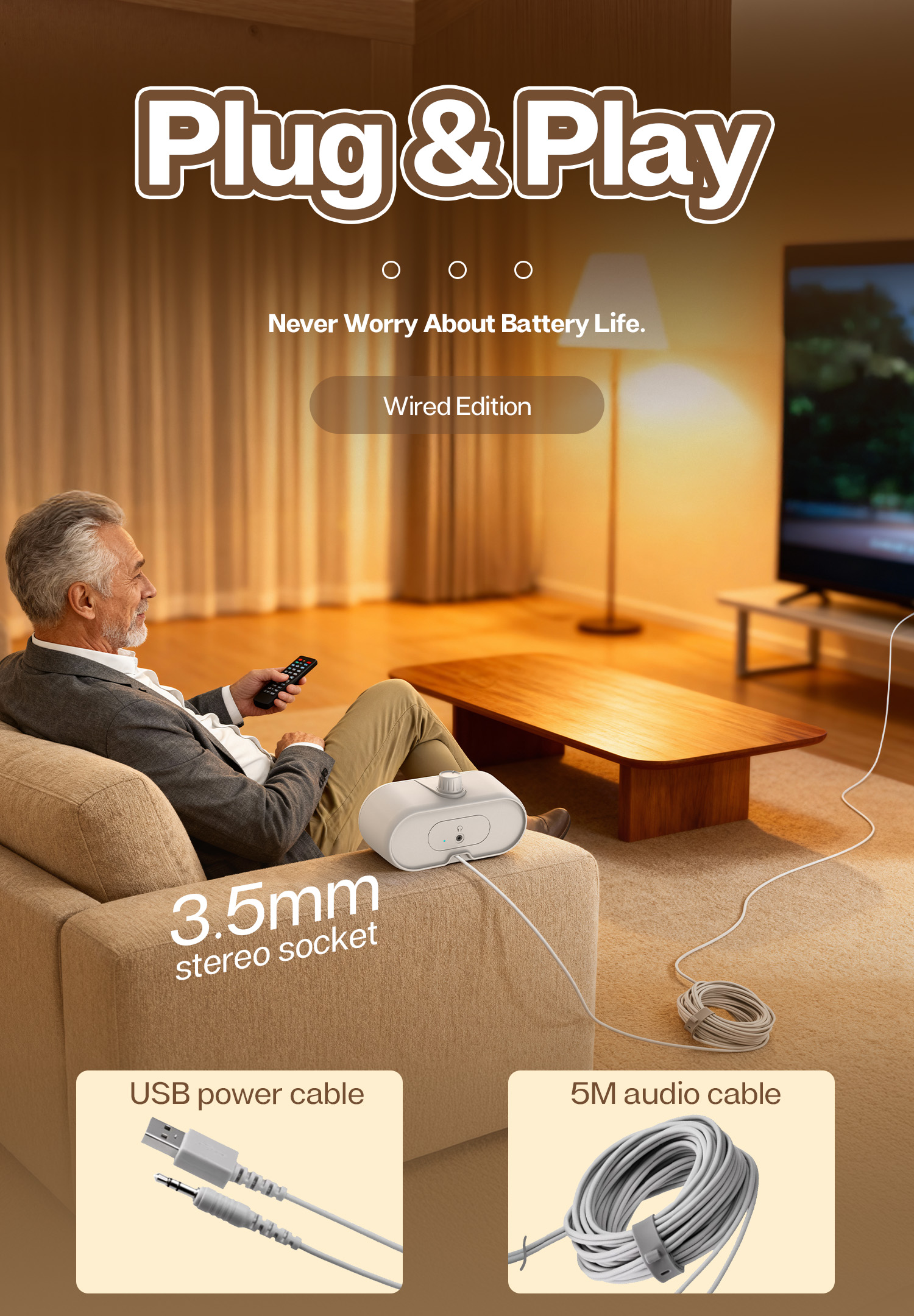 As they age, the hearing of the elderly will become increasingly blurred in the mid- and high-frequency range. it has undergone special audio processing to increase the sound pressure in the speech band and produce clearer and easier-to-hear sound. In order to make it easier for the elderly to operate, it comes with a 5-meter-long audio cable and a USB power cable. It can be directly plugged into the TV audio port to transmit audio without the problem of disconnection or delay. The volume knob on the speaker can be operated simply and directly.