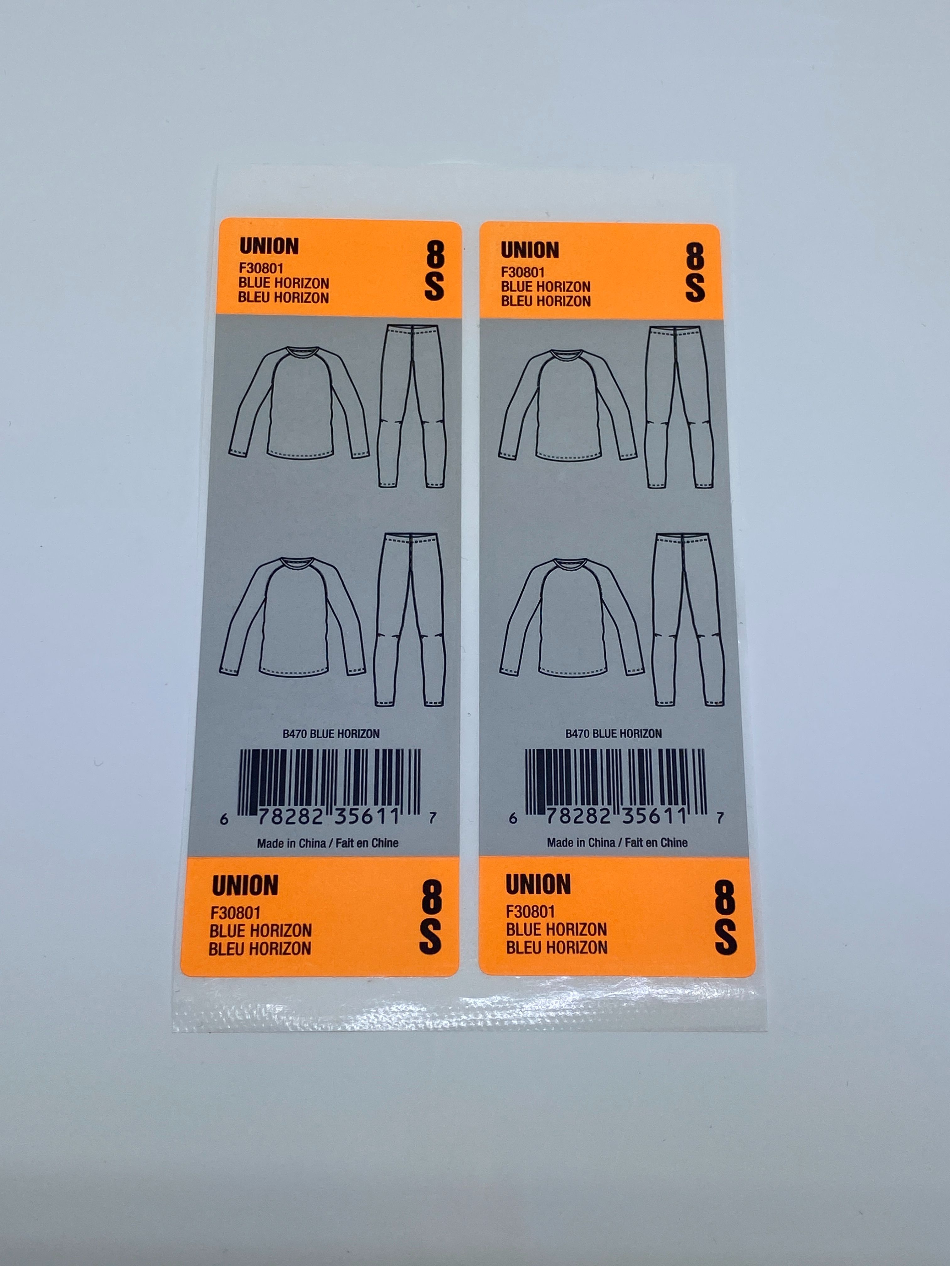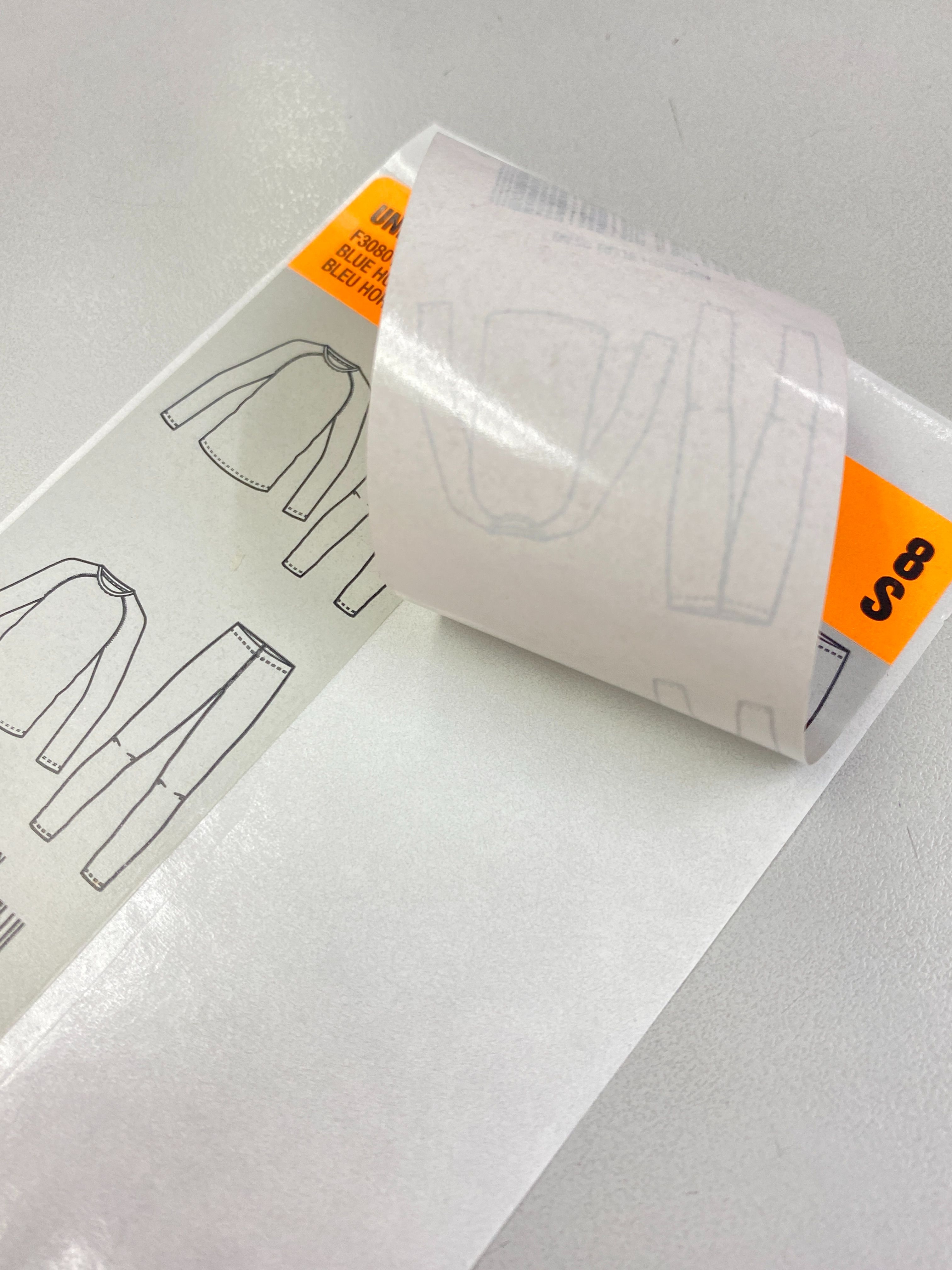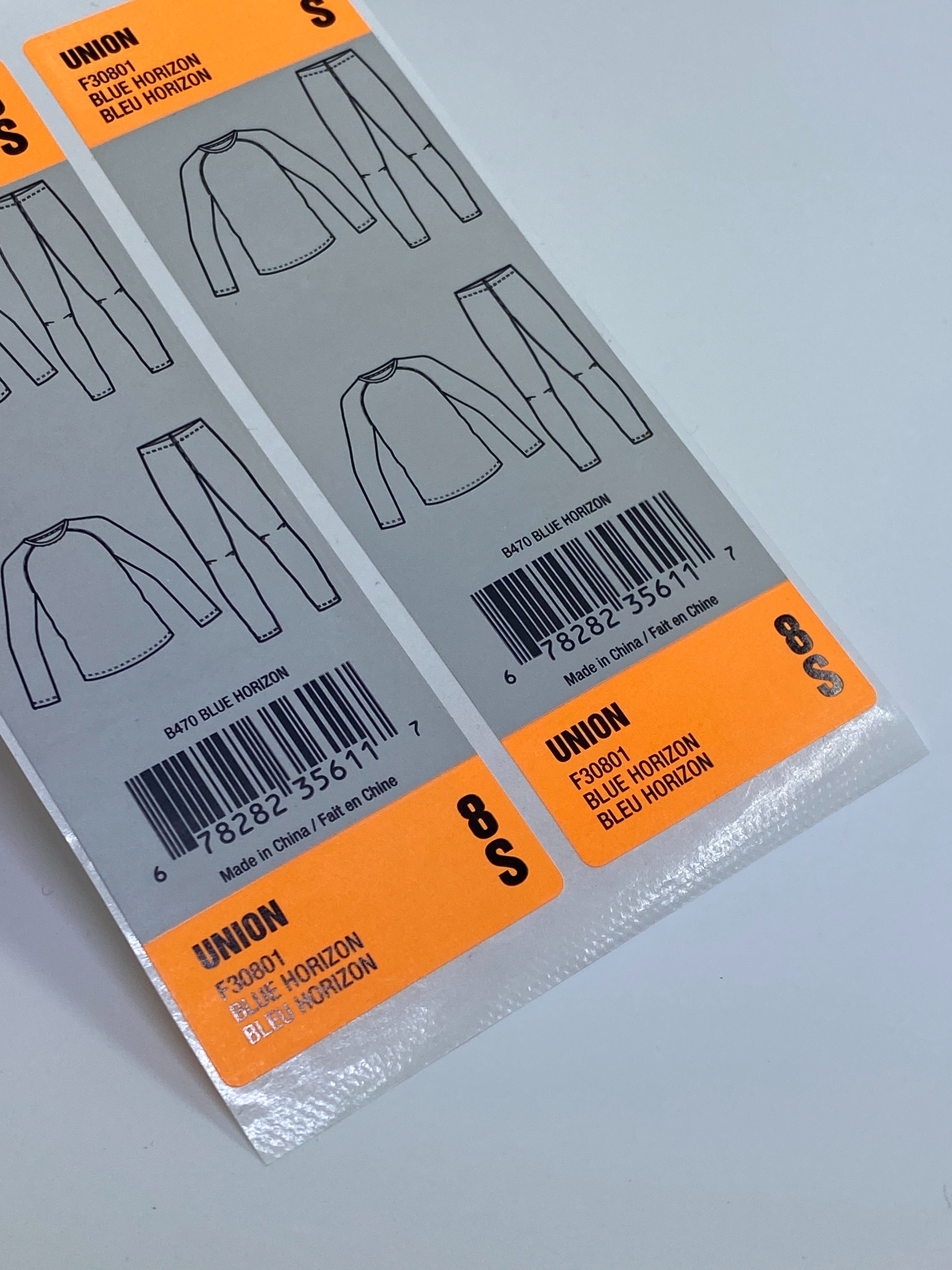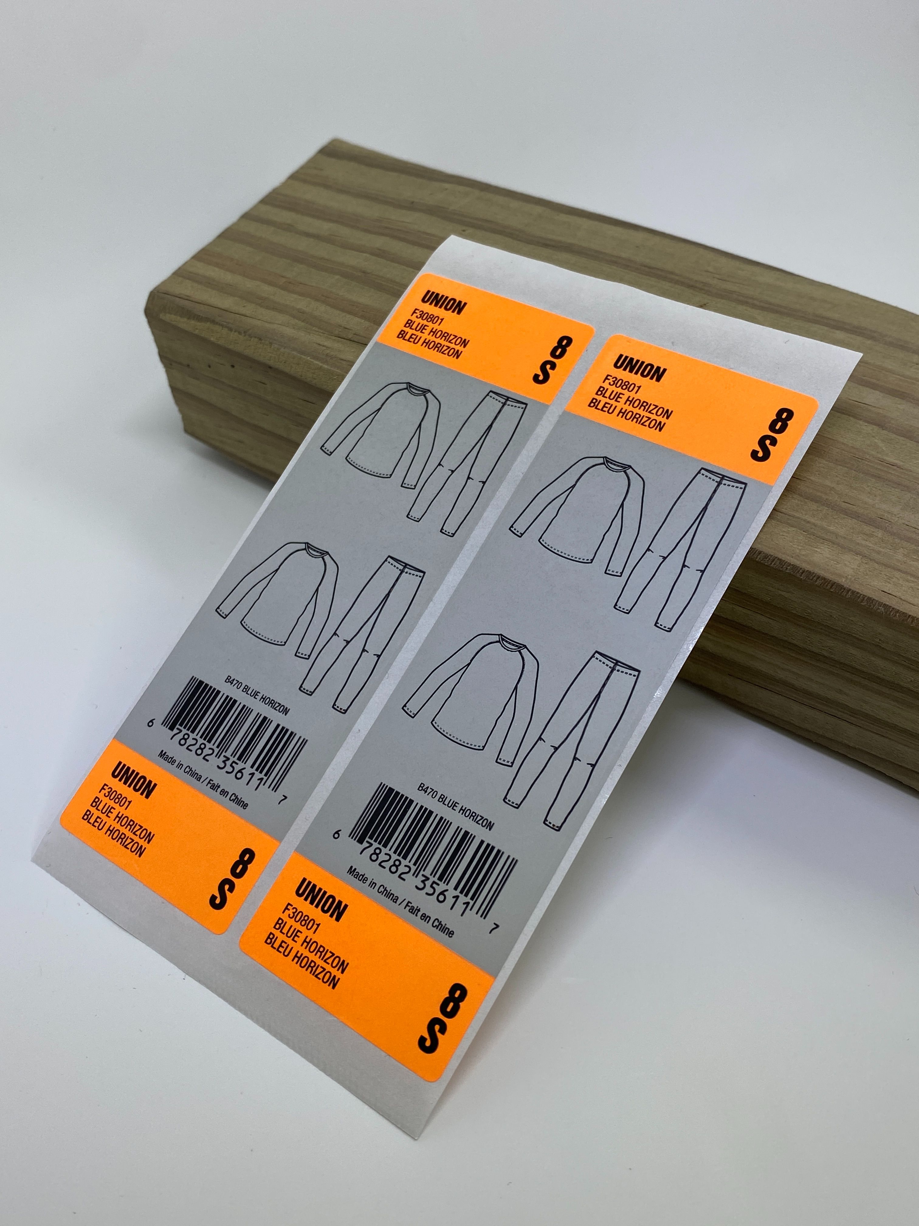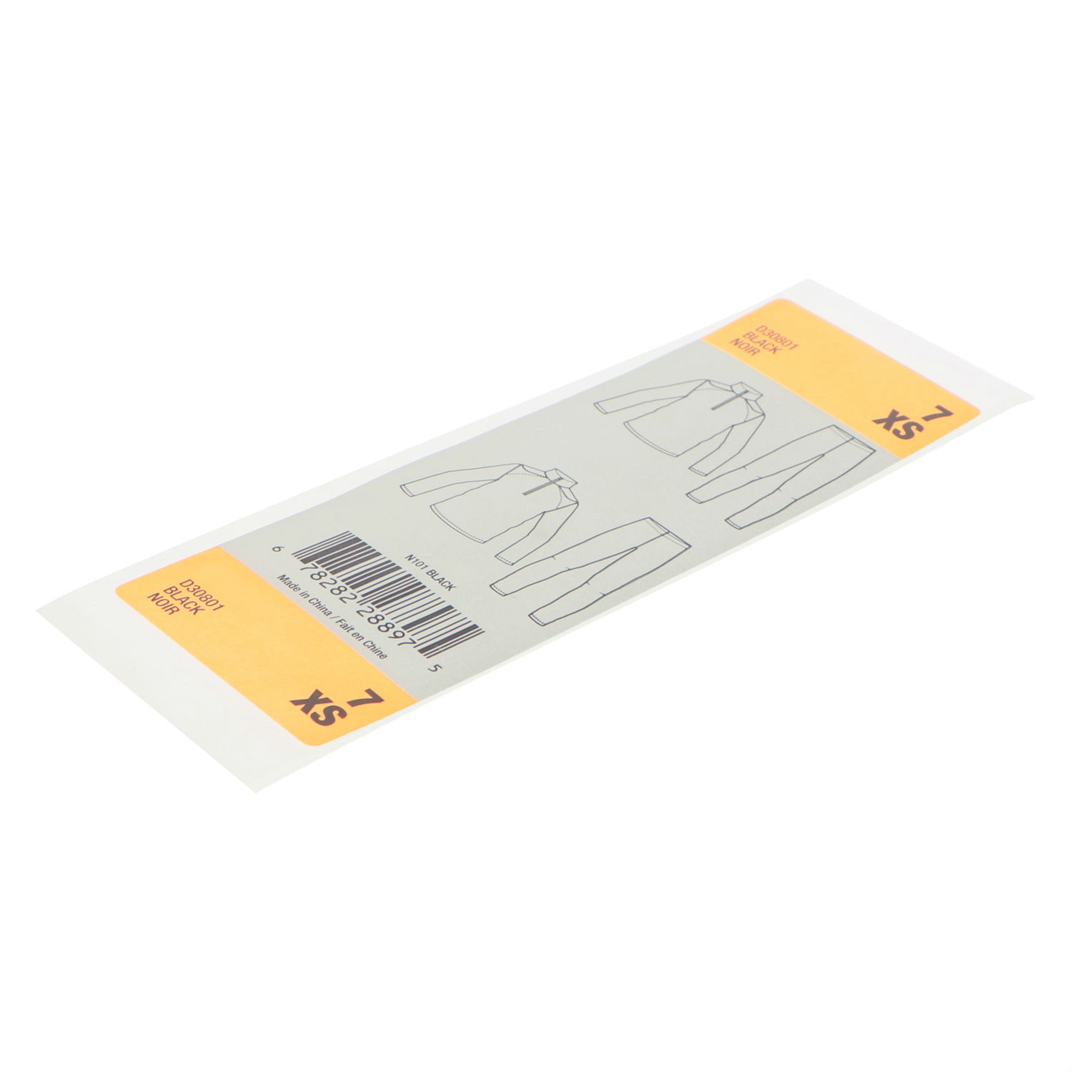 Displayed here is a matt paper sticker for garment product labeling use. It offers a clear way to show product information and is easy to attach to garment surfaces. This garment sticker is matt laminated and can be used to show size, color, barcodes and more.