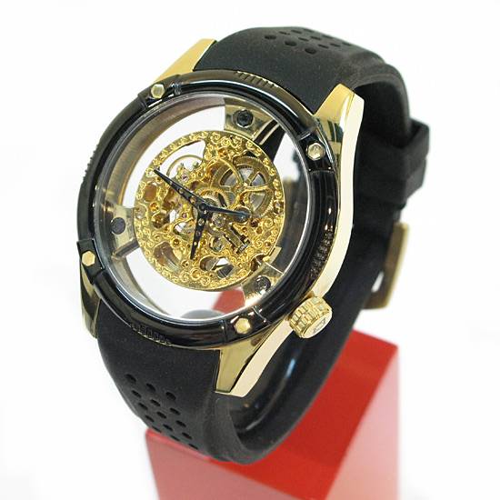 This is an automatic skeleton watch. It has a stainless steel case and a black silicon rubber strap. It is 3 ATM water resistant.