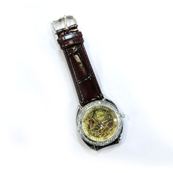 The stunning mechanical watch comes with a black leather strap. View the gold-tone movement through the stainless steel case of this beautiful timepiece. Shiny stones on bezel add a shimmering touch to the watch.