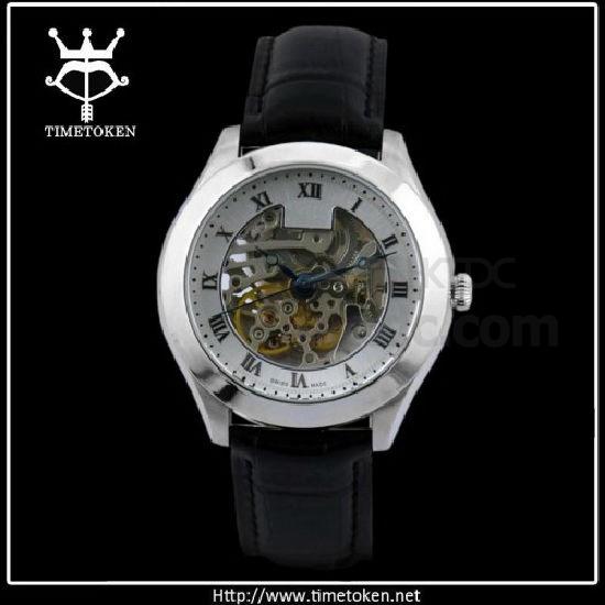 Highlighted here is an analog watch with a solid stainless steel case and genuine leather watch strap. It comes in a skeleton design and has a clear dial to show the inner mechanics of the watch. This watch flaunts meticulous craftsmanship and tells the time accurately in style and elegance.
