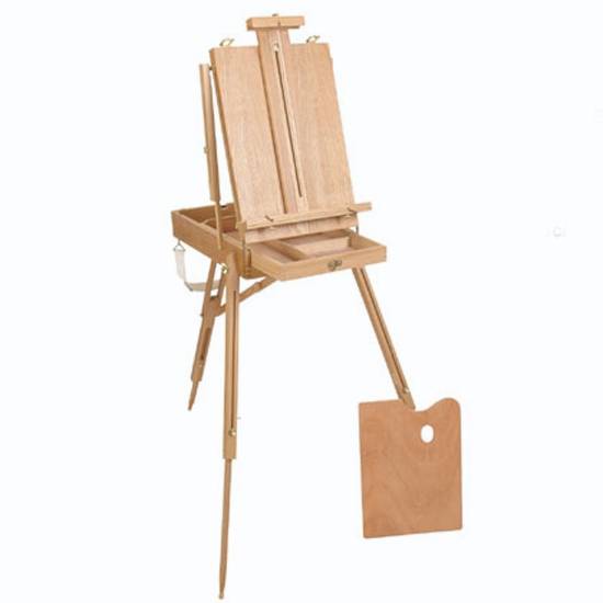 This French style easel is crafted from durable and strong wood. The three-legged easel features a painting palette and a sectioned sketch box for storage of brushes, colors, and accessories. It folds to the size of an attache case with a strap for portability. It is an ideal set for traveling artists interested in portable easel stands.