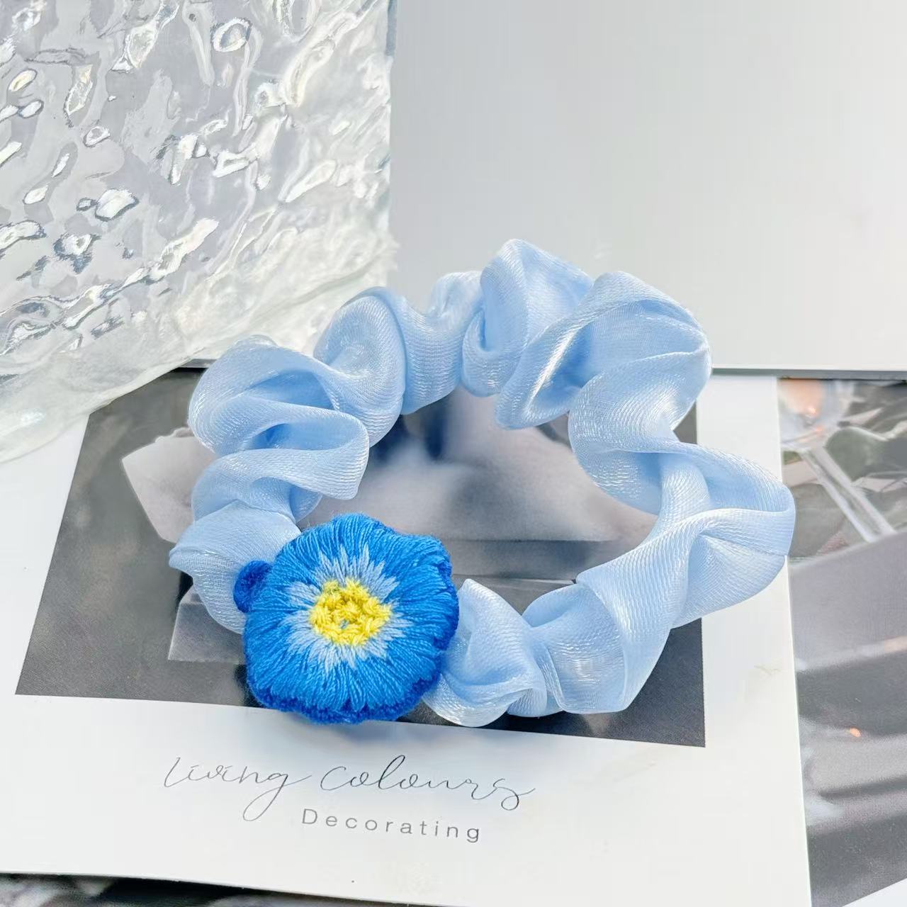 Introducing our Blue Blossom Scrunchie, a dynamic hair accessory crafted to fuse contemporary style with delicate artistry. Designed from premium, high-quality elastic, this scrunchie hugs hair gently while maintaining its captivating shape. Its vivid blue hue is enriched with intricate embroidered details in blue and yellow, capturing the essence of blooming florals in spring. Perfect for both casual and formal occasions, this versatile accessory elevates any look with a touch of elegance and charm. Enjoy effortless style and superior comfort every day with this exclusive hair tie, where fashion meets functionality for a truly unique appeal. Embrace timeless sophistication now.