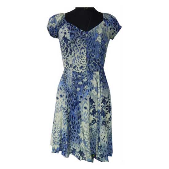 This skylar dress features a V neckline and a finely crafted bodice offering flattering fit. Ruffled skirt gives out graceful feminine accent. This blue-and-white toned patterned dress is ideal for summer days.