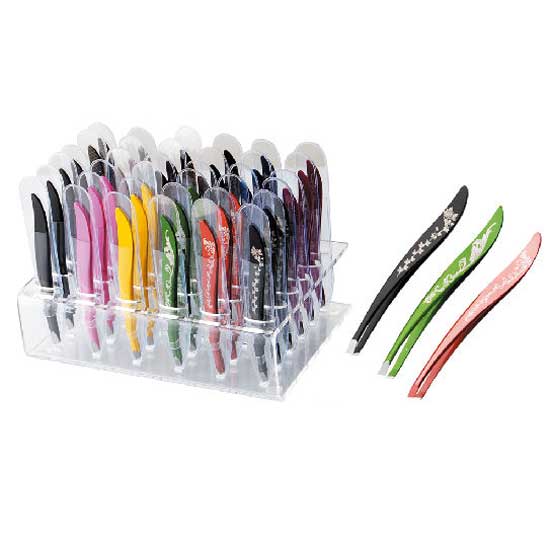 Pictured is a series of tweezers designed in delightful, fashionable colors. Each is packed in an individual package for hygienic purposes. They can be used to trim or remove facial hair like unwanted eyebrow hair or hair around the lips.