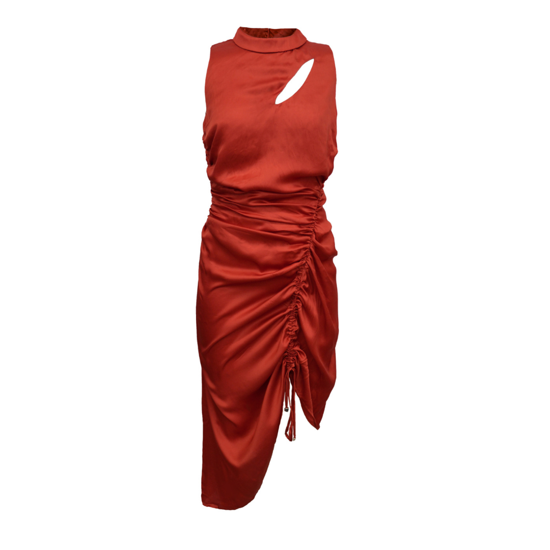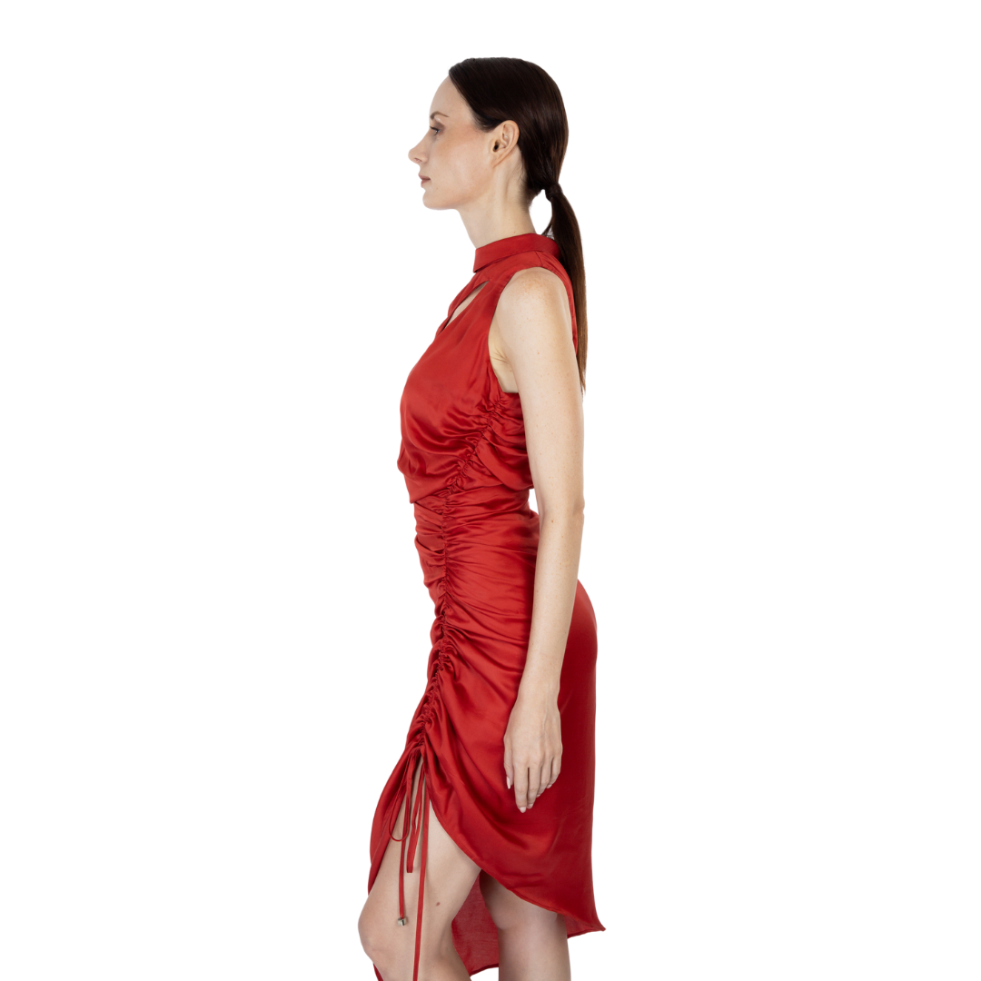 Our iconic red dress showcases a unique chest opening that exemplifies modern elegance. Crafted from Bemberg Modal construction with Azo-free red dye treatment, each piece features our signature draping detail that creates visual intrigue while maintaining sophistication.