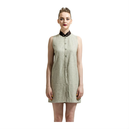 - Tall stiff collar in contrasting tone with buttons.