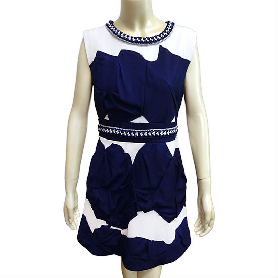 Pictured here is a beautiful piece to be added to ladies’ wardrobes. Embodying an appealing two-tone design, the dress is sewn with stylish special cut trims and exquisite braids at the waistline and collar. This sleeveless dress flaunts a texturally interesting look.