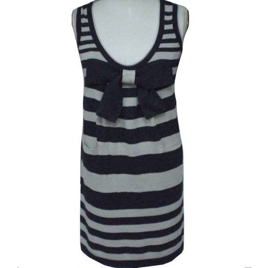 The trendy knee-length sleeveless dress comes with a deep U-neckline. It features horizontal stripes in navy blue and gray throughout the dress and a dramatic ribbon in navy blue at the bust. It also comes with two side pockets for holding miniature accessories. With a loose-fit cutting, it easily fits a large variety of body shapes and brings you gratifying comfort.