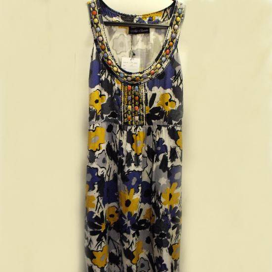 This versatile dress features abstract floral prints with exotic, colorful beading on the neckline and chest. The soft pleats at the bust-line and embroidered lines at the bottom add delicate details to the design. You can glam up or wear casually with this dress.
