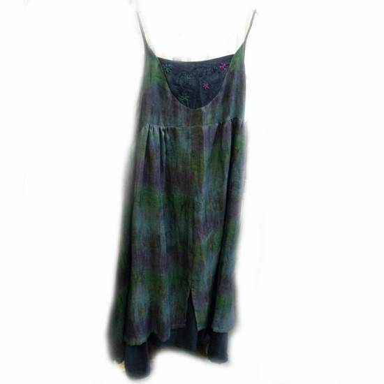 The stylish knee-length sleeveless dress comes with a boat neckline with spaghetti straps. It features a double-layer styling with the outer layer finished with gradual color bands and the inner layer decorated with star-shape embellishment. It is finely tailored with a draped hem for a loose-fit cutting which brings gratifying comfort to wearing.