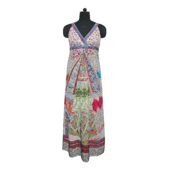 This exquisite dress is decorated with sophisticated printed patterns. The sleeveless dress has a low-cut neckline and its bottom covers your legs. Wear the well-designed dress for a more attractive dressing style.