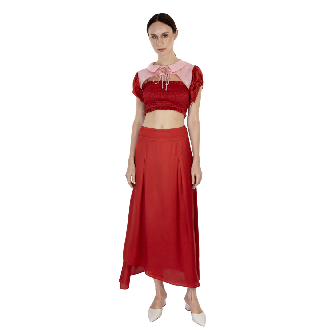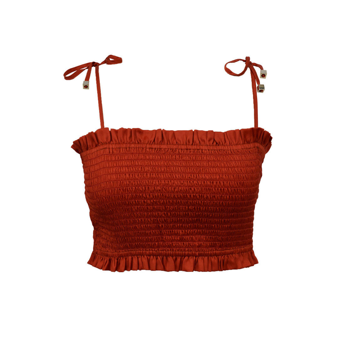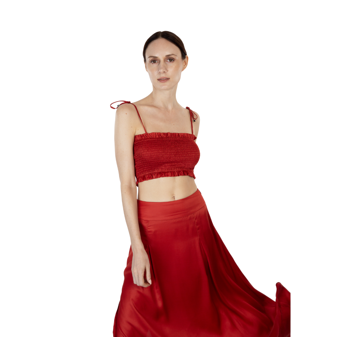a. Bemberg Modal construction b. Elegant Shirred Design c. Adjustable Back for a Custom Fit d. Premium Metal Bead Accents e. Red Color Palette