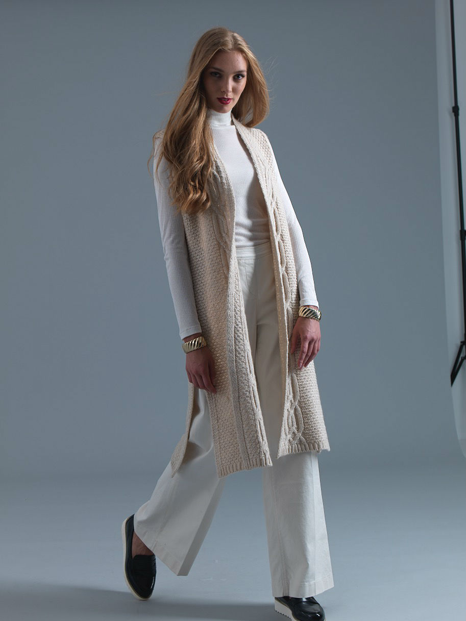 Try on a classically elegantly look with this off-white longline cardigan featuring a versatile sleeveless design. The slouchy outwear underlines subtle cable knits along the open placket, set off and finished with delicate ribbed hem as well as alluring slits at the sides to slightly enhance the slender silhouette.