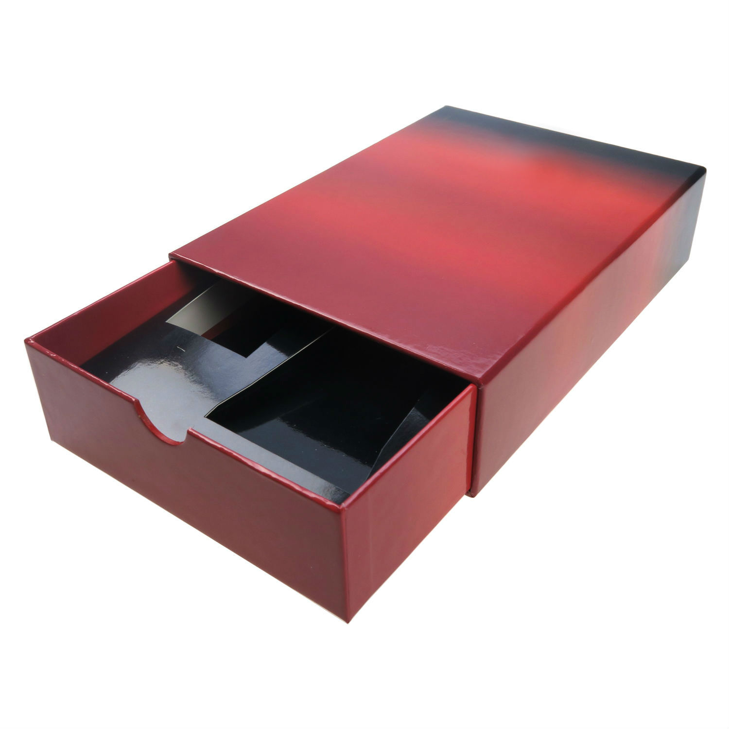 This slide box is crafted in a two-piece structure where the box slides out sideways from the cover. It is built with rigid paperboard with paper card insert. This slide rigid box features a unique UV spot finish with PP laminate for a highly luxurious look.