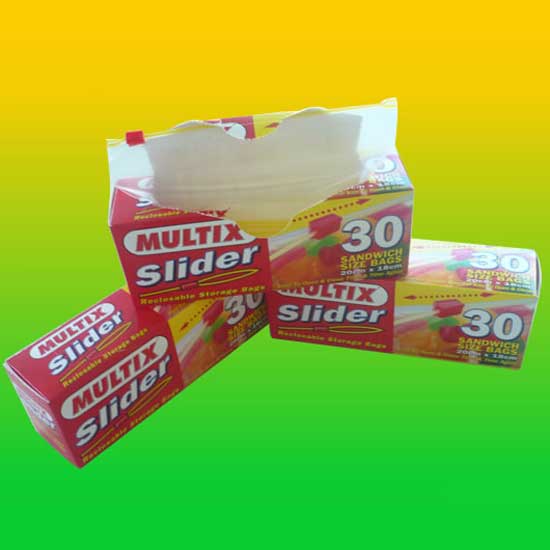 Outlined is a zip seal bag with a slider closure to lock the freshness of food. The potent plastic material can be reused and is environmentally friendly. This slider bag is the perfect choice for packaging leftovers.