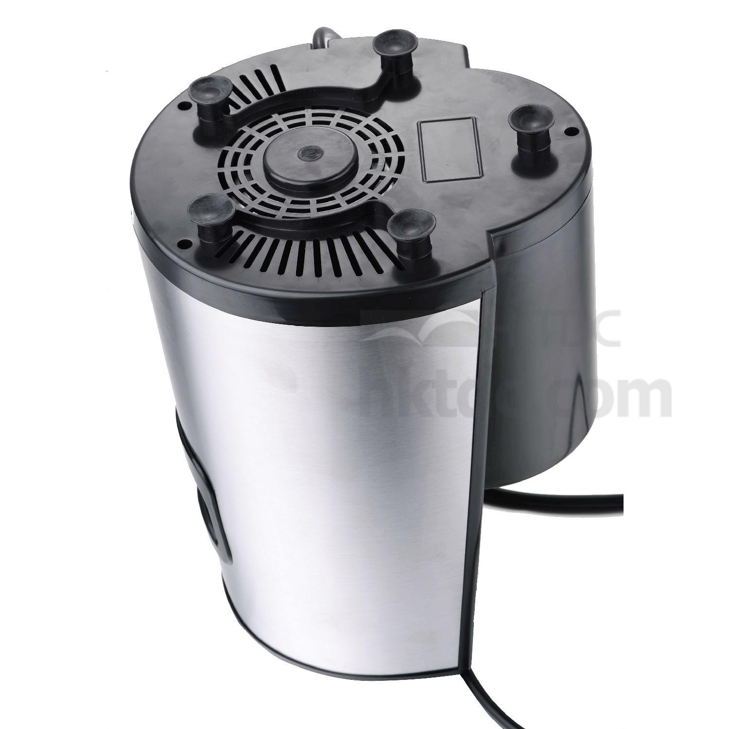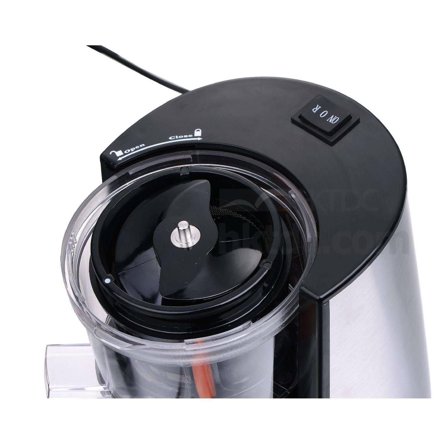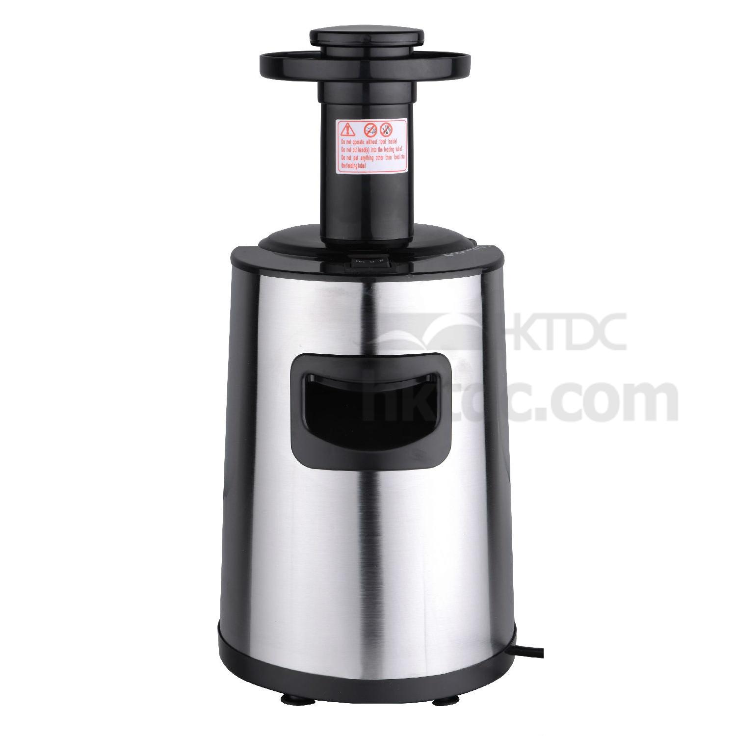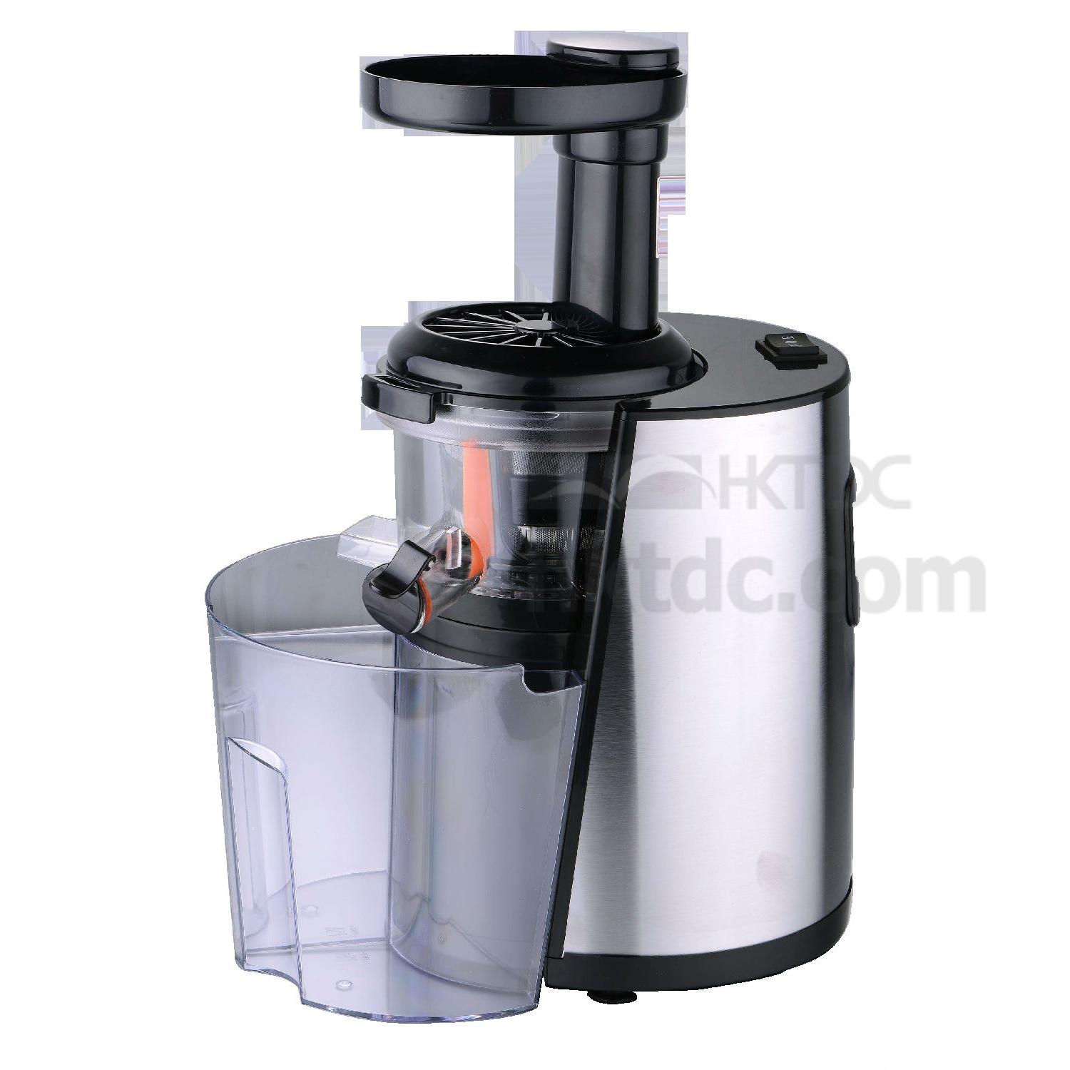 This slow-speed juicer comes in a cylindrical shape in silver and black. It boasts a transparent bowl for storing the extracted juice. The electrical juicer is an ideal addition to any modern household kitchen.