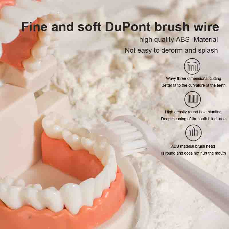 Soft dupont silk fits teeth, clears teeth and improves roundness, protects sensitive and fragile pacifier, high-quality ABS material is not easy to deform and splash, wavy 3D cutting fits tooth radian more, high-density circular hole planting enhances tooth cleaning blind area, ABS material is easy to damage brush head round, not oral cavity.